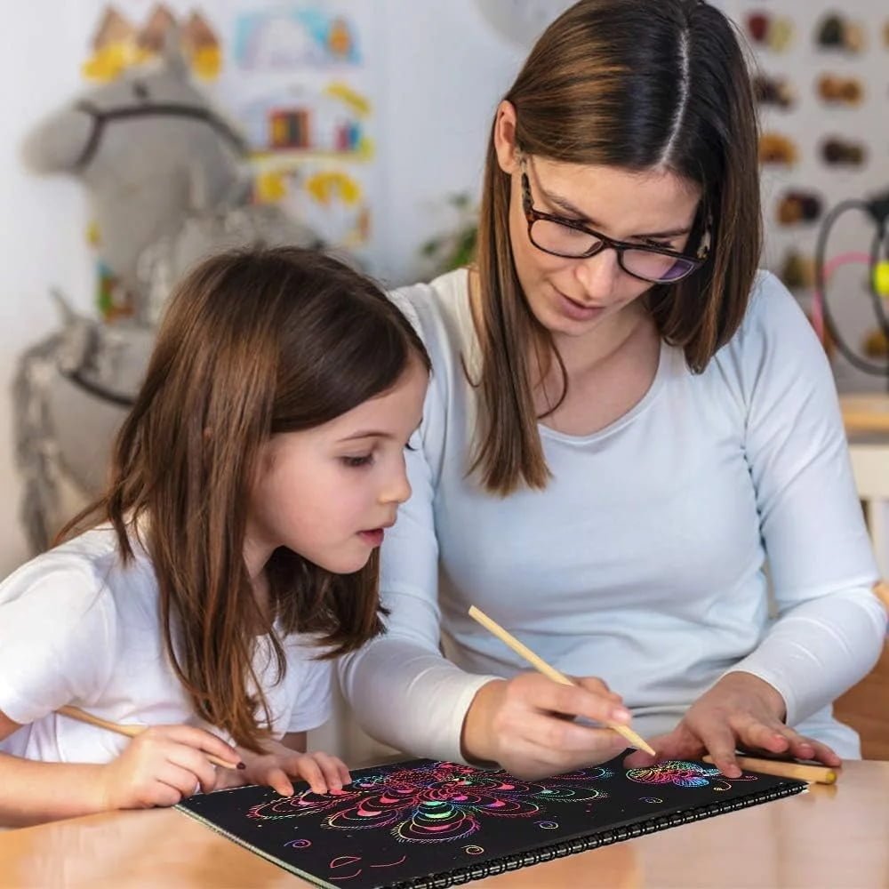 BSHAPPLUS 4 Pack Rainbow Scratch Paper Notes with painting stencils. Children can draw on paper and use wooden stylus to create their wonderful ideas, their creativity, intelligence and practical ability have been expanded. Of course, parents can also paint with babies and think together about how to draw an attractive painting, you and your kids can experience the fun of creation in this process. One of the most interesting ways for you to communicate with your kids. These stylus were made of wooden material, which is healthy and safe. The drawing paper is non-toxic, non-odor, tear-resistant, abrasion-resistant and does not fade in water. Do not need to worry about accidentally spilling water on the paper or accidentally tearing it anymore.