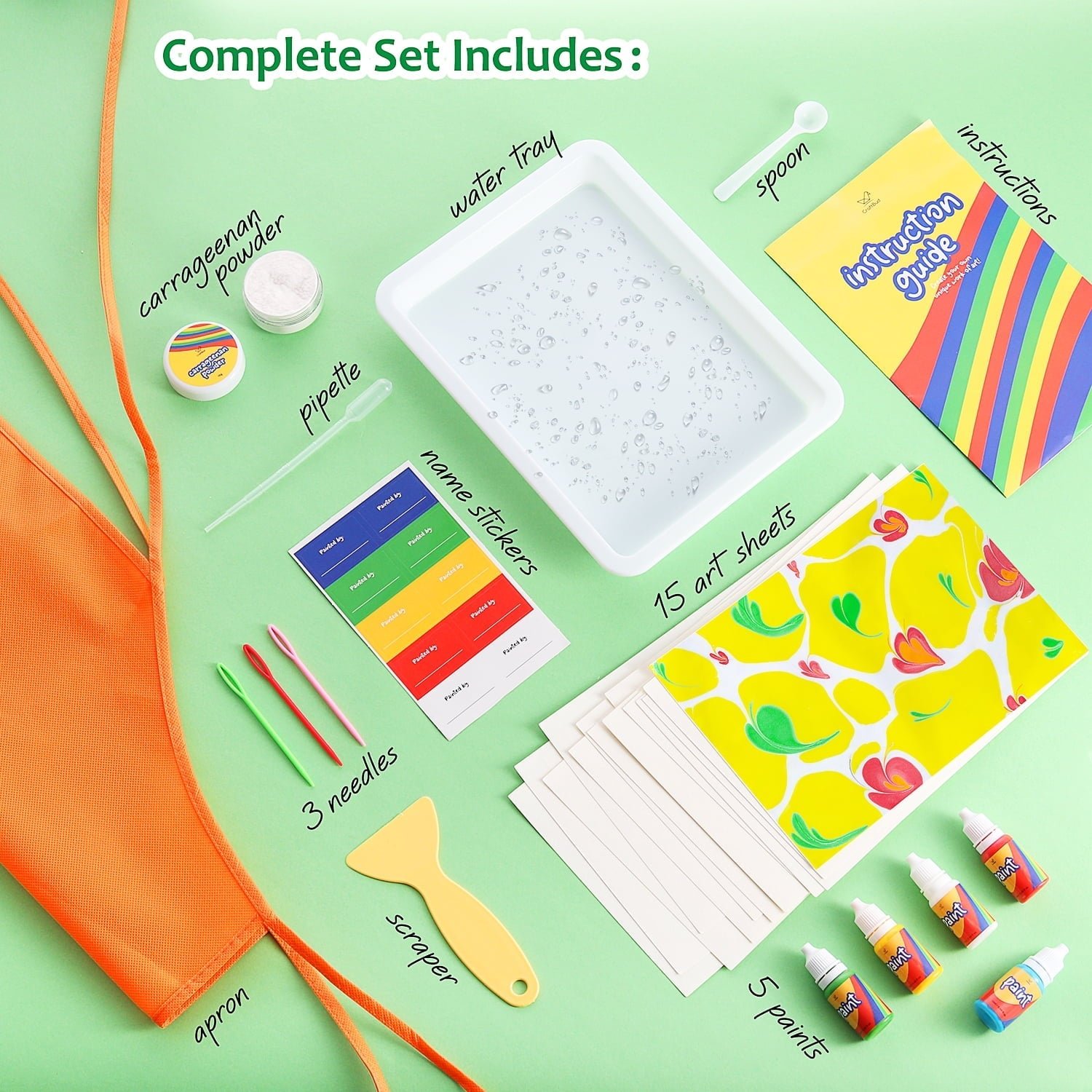 Create one-of-a-kind artwork with CraftBud’s compelling art project. Drip colorful paint onto water, layer and swirl to create unique designs, with our craft supplies kit, then lift the artwork off the water, transferring it to an art sheet. Includes everything kids need to create over a dozen individual works of art, with 5 acrylic paints in vibrant colors, 15 art sheets, and an easy-to-follow instruction guide. In addition to the design tray, spoon, and styluses, this kit includes an apron to keep paint away from clothes, and cute stickers to decorate the artwork once it’s dry. Craft kits for kids are a great gift idea for kids’ birthday parties and holiday activities.