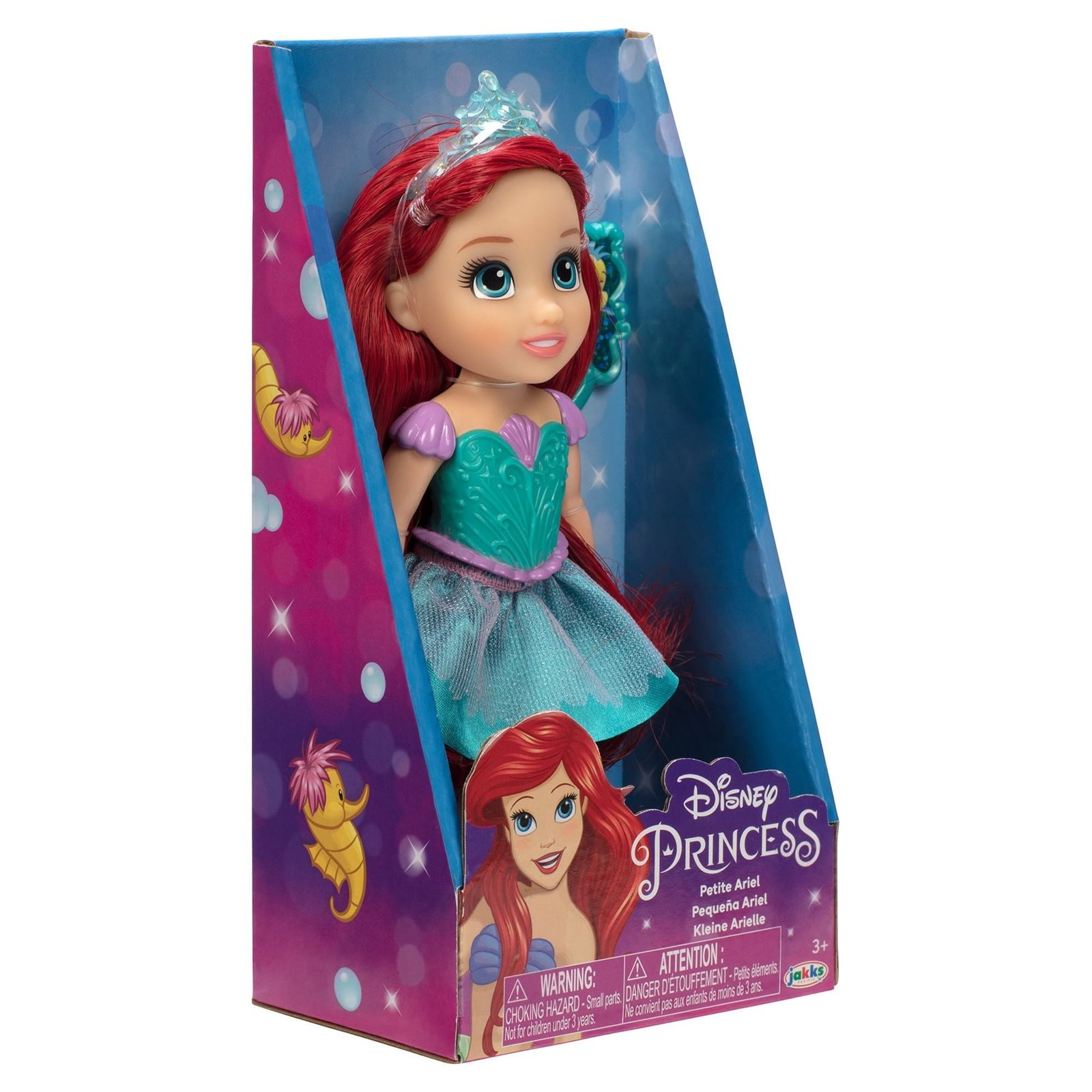 Explore your underwater friendships with this pocket-sized Ariel, dressed in her mermaid skirt, shoes, and tiara! Play out your favorite movie moments with this charming doll and comb. Perfectly petite in size, these dolls can travel with you anywhere! Gift them to someone who loves Disney Princess and watch their imagination soar! Collect all of the Disney Princess Petite Dolls.