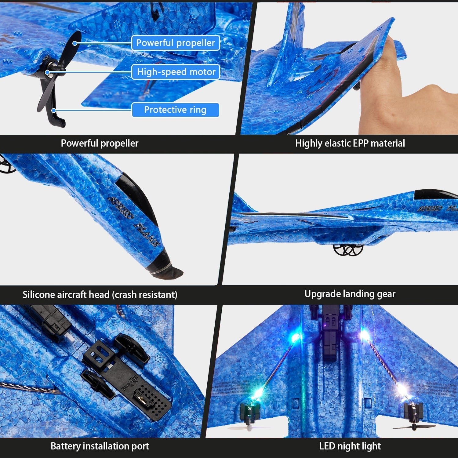 - 【Professional Design】Featuring an aerodynamic design and rear push dual engines, our RC airplane offers superior power and gliding performance. Enjoy an impressive night flight with light bars and a stable 2.4 GHz remote control system, providing a control range of over 150 meters for an unmatched flying experience.