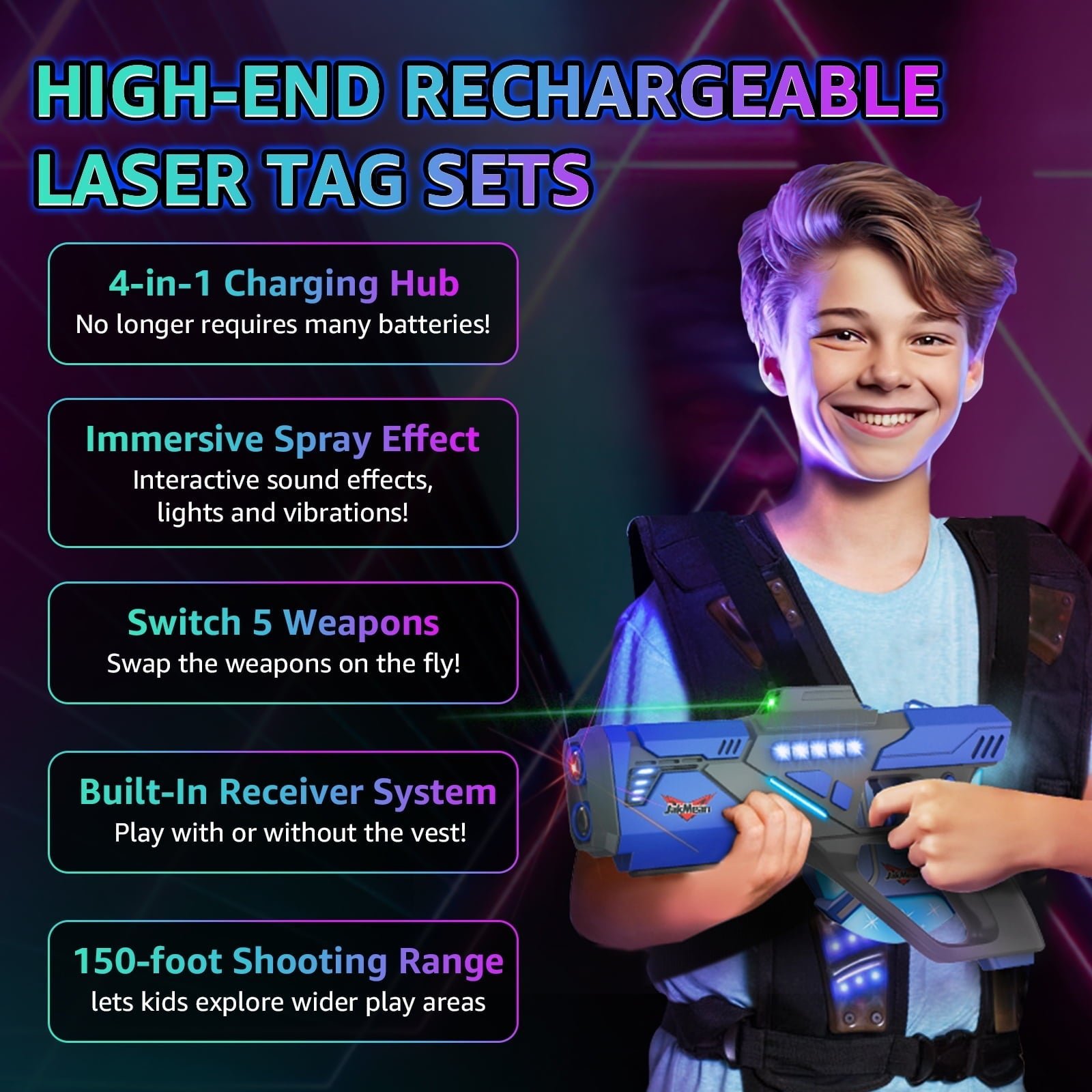 Laser Tag brings epic multiplayer fun for up to 4 teams! With 5 weapon modes, lifelike sounds, and hit-activated vibrations, it’s a thrilling battle experience. Rechargeable batteries ensure long playtime, while LED indicators and water spray add realism. Voice commands and a 150ft range make it beginner-friendly and perfect for outdoor action. The ultimate gift for kids, creating unforgettable family memories!